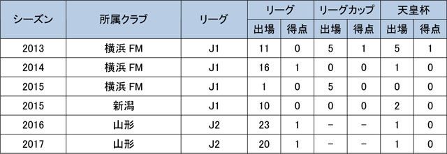 しらとり台FC→横浜F・マリノスプライマリー→横浜F・マリノスJrユース→横浜F・マリノスユース→国士舘大→横浜F・マリノス→アルビレックス新潟→横浜F・マリノス→モンテディオ山形