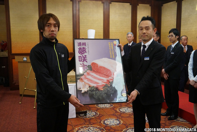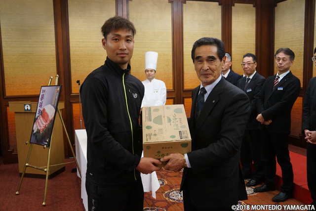御前崎市長栁澤重夫様による歓迎の挨拶と共に、御前崎市が積極的に手がけているお茶「つゆひかり」を贈呈いただき、静岡カントリーグループ様からは地元のブランド牛「夢咲牛」を頂戴いたしました。