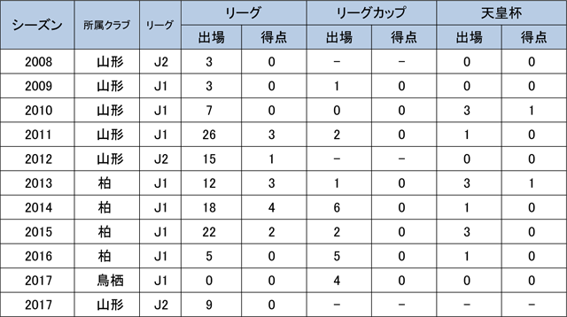 柏レイソルU-12→柏レイソルU-15→柏レイソルU-18→モンテディオ山形→柏レイソル→サガン鳥栖→モンテディオ山形