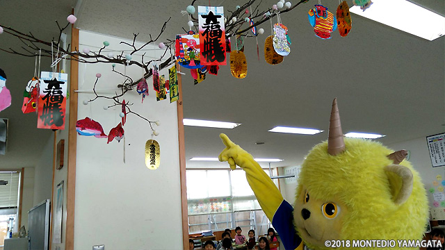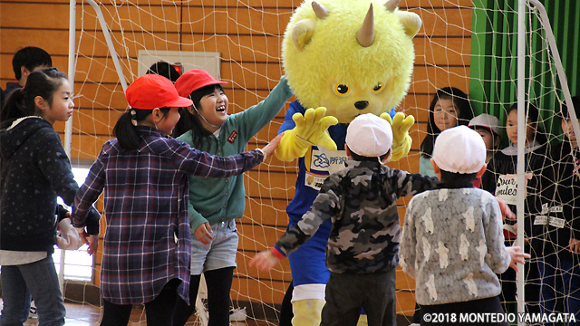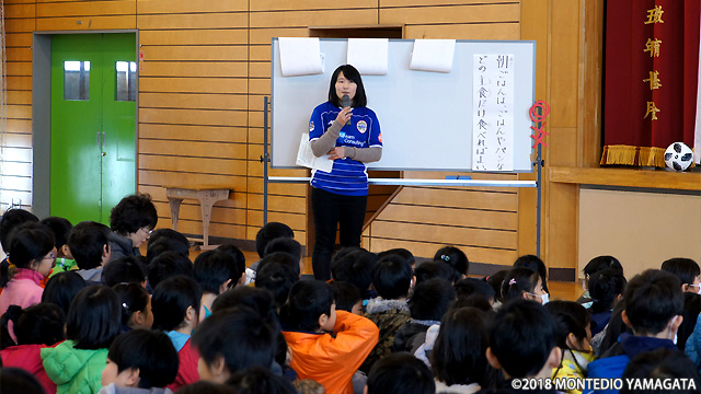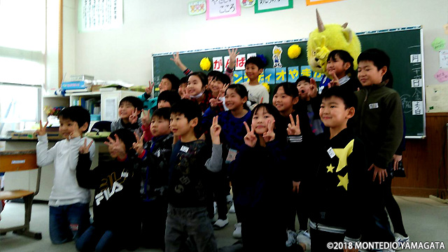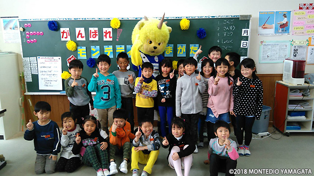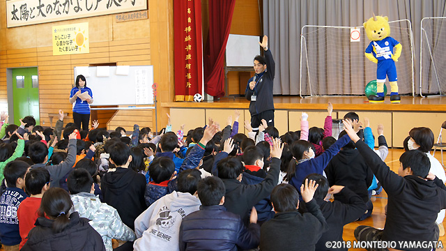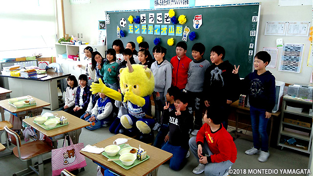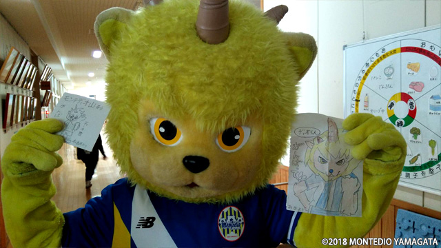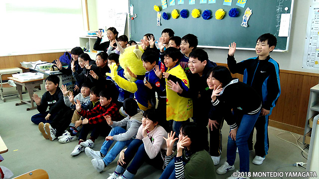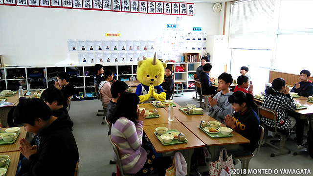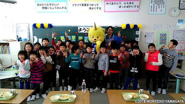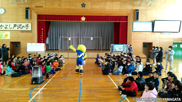 大寒波に見舞われている山形、そんな大雪の中、村山市の戸沢小学校にディーオが食育の先生として授業を行いました。133名の子供達から熱い歓迎を受けて入場し、栄養士の先生と一緒にディーオが朝ごはんの大切さをクイズ形式で伝えました。