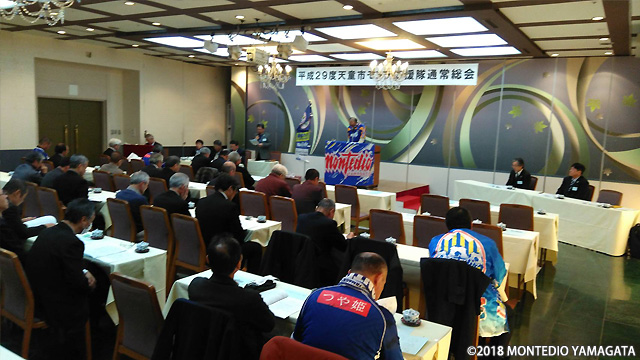天童市内の全12公民館それぞれに、「モンテ応援隊」というモンテディオ山形の支援組織が結成されており、その応援隊から総勢60名ほどが一堂に介し、天童温泉ホテル王将にて総会は行われました。