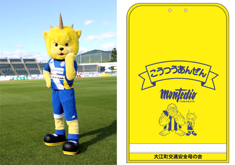 贈呈されるランドセルカバーは子供達の安全と健やかな成長を祈って、弊クラブマスコットのディーオとモンテスがデザインされたランドセルカバーを大江町交通安全母の会様と共同で製作したものです。
