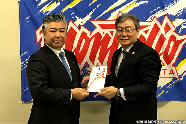 2018年2月23日、弊社スポンサー・賛助会員の山寺観光タクシー株式会社代表取締役土屋 秀昭様より、モンテディオ山形応援タクシーのロイヤリティー贈呈を頂きました。