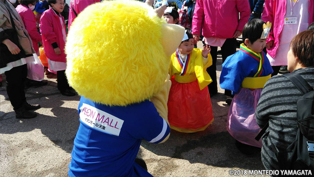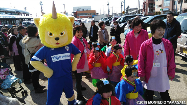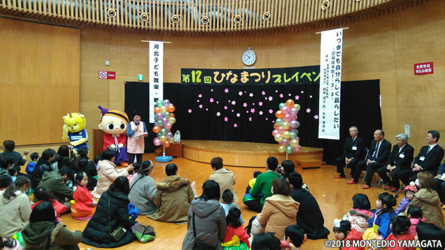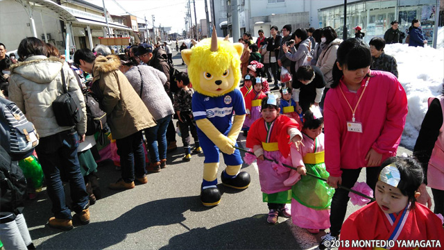 田宮栄佐美河北町長と若松正俊山形県副知事とも記念撮影を行い、外に出てひなまつりパレード に参加しました。子供達はみんな堂々と行進していましたよ!