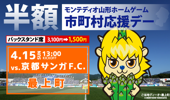 2018年4月15日(日)に開催されるモンテディオ山形ホームゲーム 京都サンガF.C.戦において、最上町在住・在勤の方を対象にバックスタンド自由席一般を当日券価格より半額以下で購入できる、お得な「市町村応援デーチケット」を販売しますのでお知らせします。対象の市町村に在住・在勤の方は是非スタジアムにお越し頂きサッカーをお楽しみ下さい。