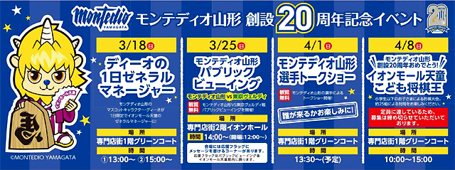 弊クラブスポンサーのイオンモール天童様4周年祭として行われている「モンテディオ山形創設20周年応援企画」の一環として、モンテディオ山形の選手が参加するトークショーを開催しますのでお知らせします。
