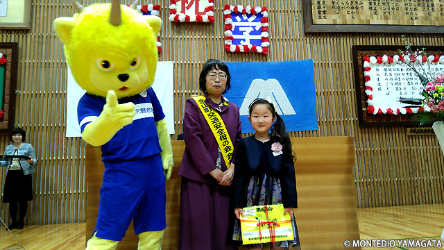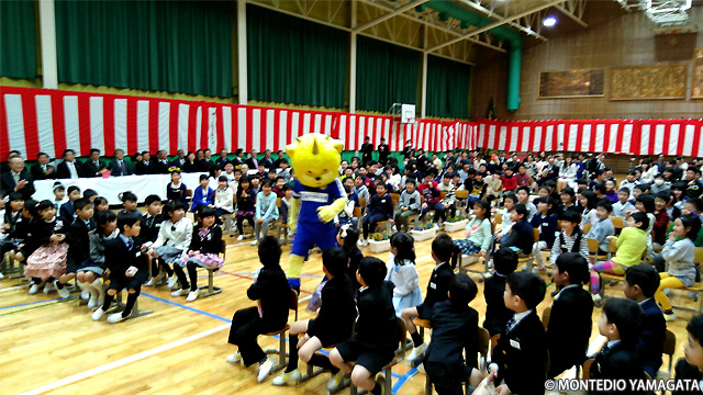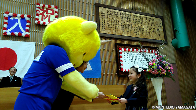 厳かな雰囲気の入学式に、急きょ登場したモンテのカモシカの神様。