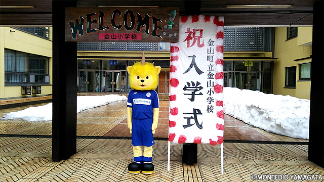 ディーオは金山町交通安全母の会とクラブが連携し、作成・贈呈されるランドセルカバーを新入生に手渡すため、同町の金山小学校を訪れました。