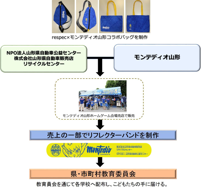 2018年4月28日(土)開催の栃木SC戦より、NPO法人山形県自動車公益センター様、株式会社山形県自動車販売リサイクルセンター様とモンテディオ山形が連携し、制作したrespec×モンテディオ山形コラボバッグを販売いたします。購入頂いた方先着50名様でモンテディオ山形オリジナルリフレクターバンドをプレゼントいたします。