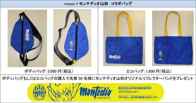 NPO法人山形県自動車公益センター様、株式会社山形県自動車販売リサイクルセンター様とモンテディオ山形が連携し、respecブランドでバッグを販売します。また、購入していただいた方に先着50名様にモンテディオ山形オリジナルリフレクターバンドをプレゼントいたします。