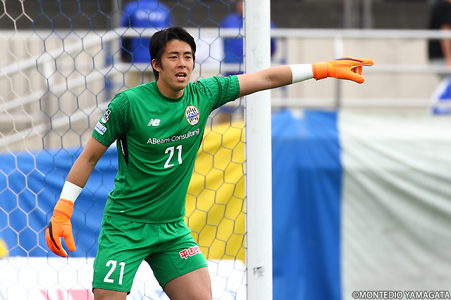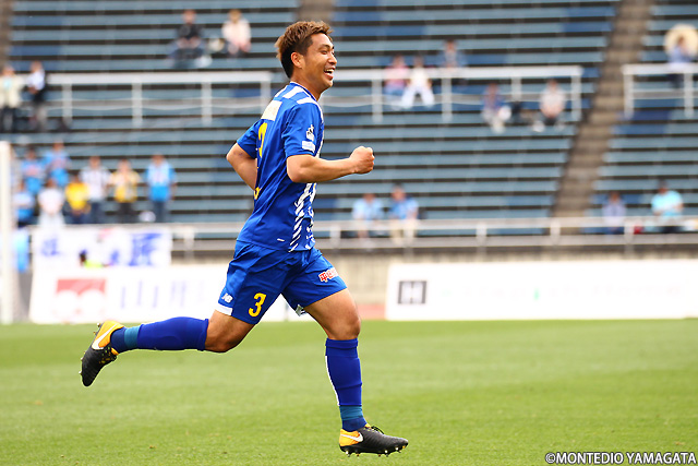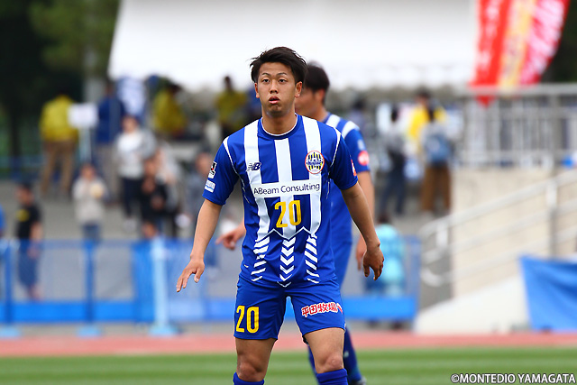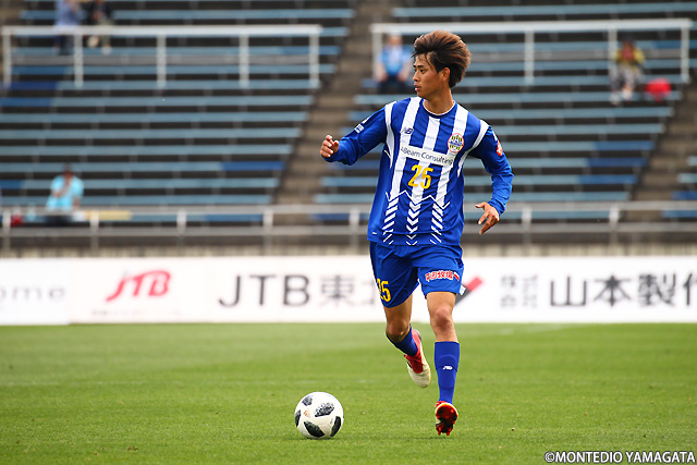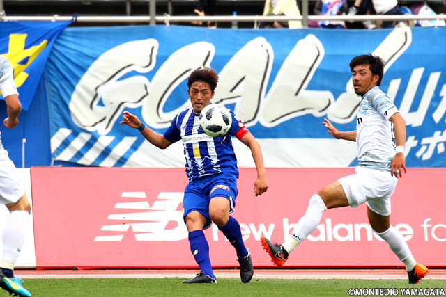 前節に引き続いてスタメンとなり、モンテディオ山形の選手として、初めてNDソフトスタジアム山形のピッチに立った櫛引政敏選手。