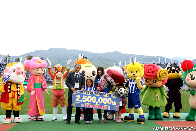 モンテディオ山形が1999年にJリーグに参入しホームゲームのこれまでのリーグ戦総入場者数が250万人を達成しました。ハーフタイムには250万人目の入場者の方に記念品を贈呈させて頂きました。
