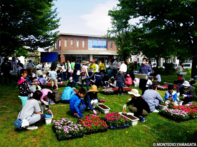 カマタマーレ讃岐戦が行われた2018年5月6日、天童市立長岡公民館の春の風物詩「花いっぱい運動」の花植えが行われました。