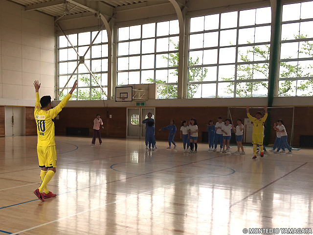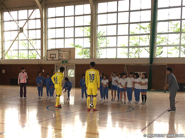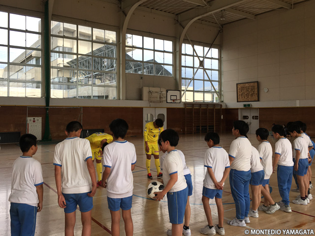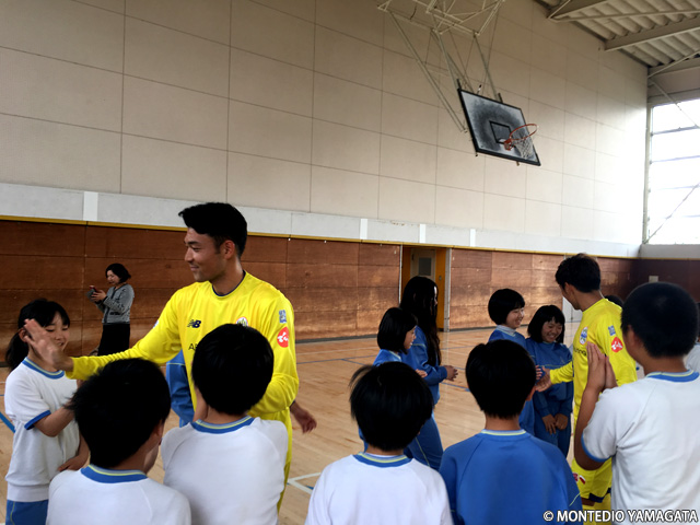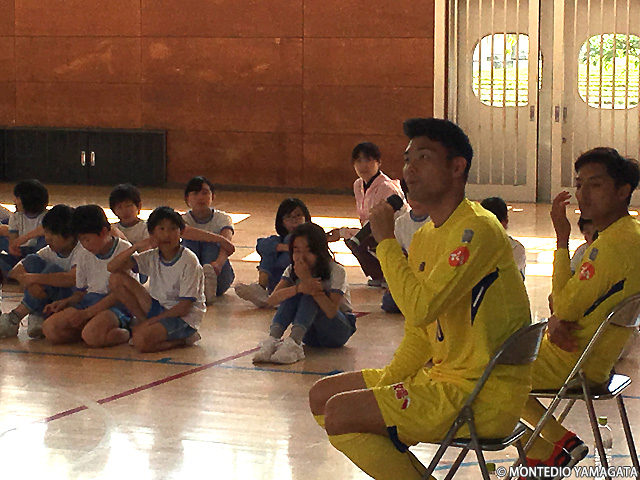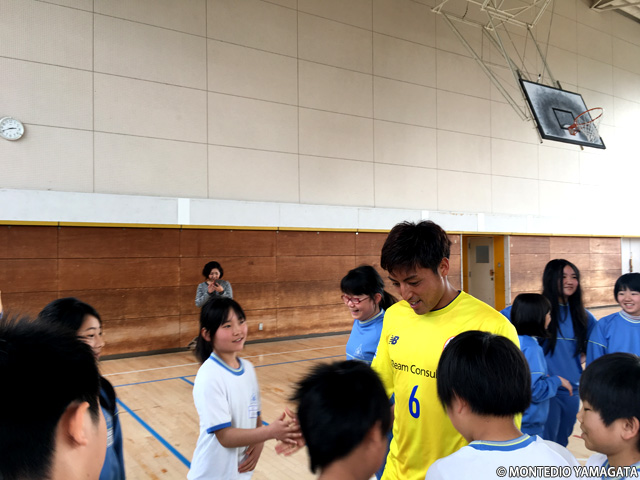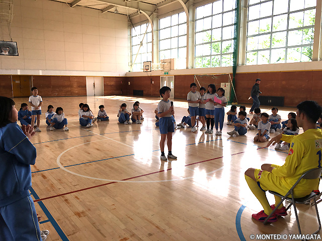 寒河江市立南部小学校6年生61名との夢クラス。この日に合わせて、サポーターズユニフォームを着た児童代表による挨拶で始まります。