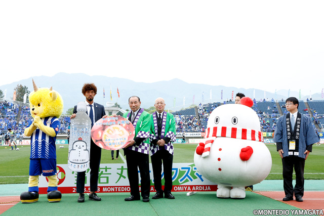 この試合からモンテディオ山形のオフィシャルユニフォームスポンサーとして「雪若丸」が加わりました。そこでこの試合も「雪若丸 サンクスマッチ」として開催頂き、新しいスポンサーのお披露目に相応しい盛り上げをして頂きました。