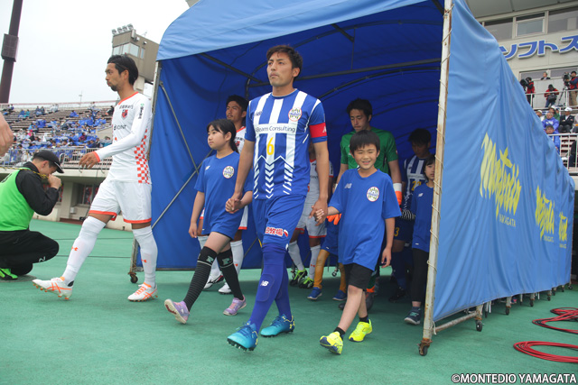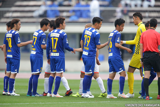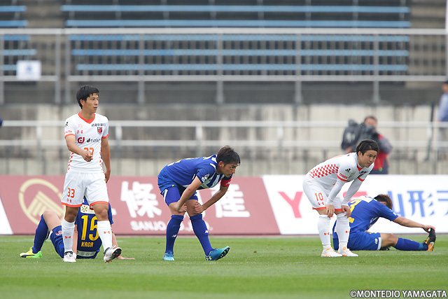 モンテディオ山形の選手たちは逆転ゴールを目指して戦い続けますがゴールはならず1-1のドローに。