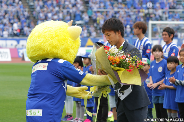 試合前、先日の松本山雅FC戦でJリーグ通算100試合出場を達成した南秀仁選手に花束の贈呈が行われます。