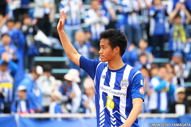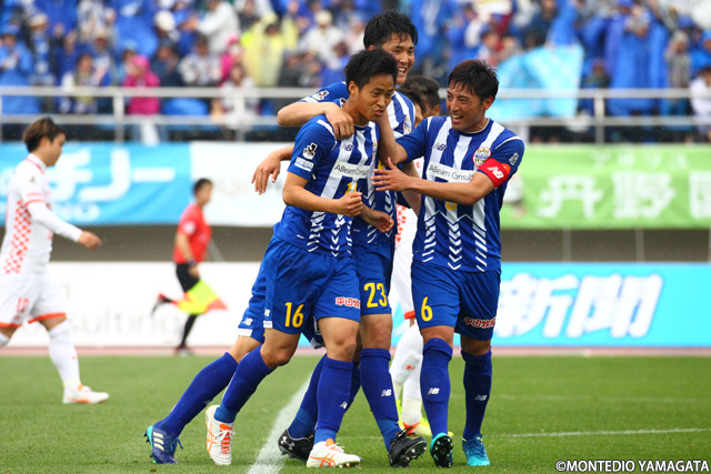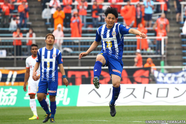 小林成豪選手の今季3点目は、NDソフトスタジアム山形では初のゴール。スタンドを大いに沸かせます。