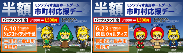 2018年6月に開催されるモンテディオ山形ホームゲームの市町村応援デーチケットを下記のスケジュールで販売いたします。対象市町村に在住及び在勤の方はバックスタンド自由席一般を当日券価格より半額以下で購入できる、お得なチケットとなります。対象の市町村に在住・在勤の方は是非NDソフトスタジアム山形にお越し頂きサッカーやイベントを思う存分お楽しみ下さい。