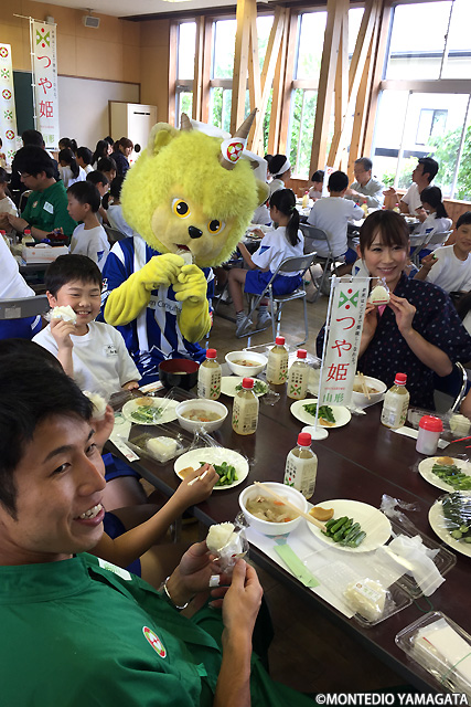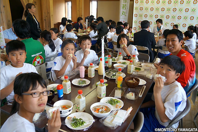 そして、田植えの後は山形市立南山形小学校で田植えを一緒に頑張ってくれた5年生の子どもたちと一緒に昼食をいただきました。