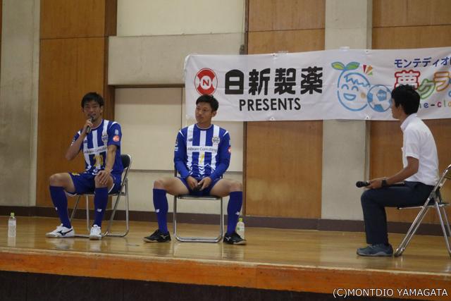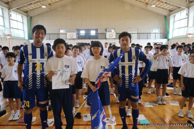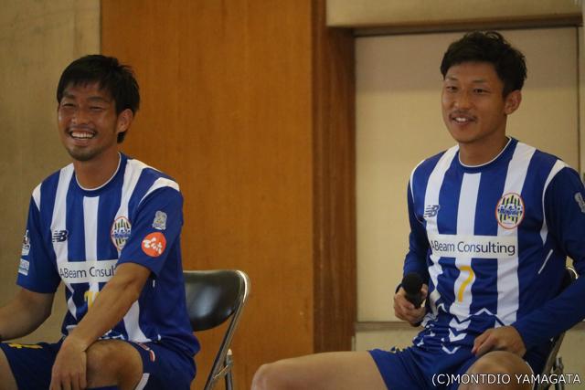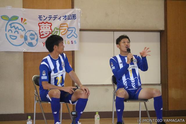 天童三中を訪れたのは松岡亮輔選手と古部健太選手、プロサッカー選手としてそれぞれ約10年のキャリアを持ち、学生時代も教職資格を取得し、職業選択についても強い意識を持っている選手。
