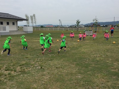 あいにくグラウンドコンディションにも元気に園庭サッカーです!