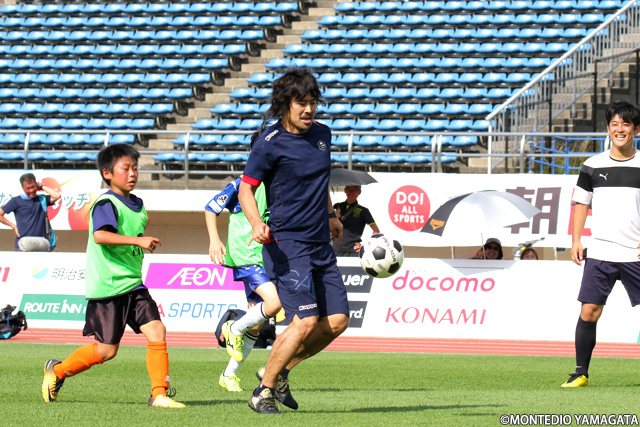 日中は夏を思わせる暑い一日でした。その中で、晃永運輸株式会社×ZAIZEN FOOTBALL SCHOOLが開催され、子どもたちがボールを追いかけます。その中心にいたのは、NDソフトスタジアム山形のピッチに帰ってきたモンテディオ山形の元10番・財前宣之さん。変わらぬテクニックを披露しながら、楽しそうに子どもたちとボールを追いかけます。