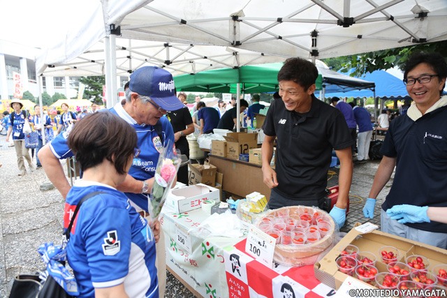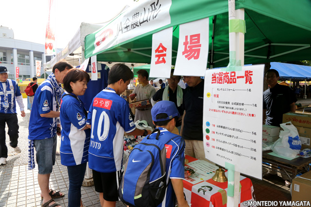 この試合は長年チームをご支援頂いているJA全農山形様による「JA全農山形さくらんぼサンクスマッチ」として開催されました。美味しくて楽しいイベントが行われ、来場者の方を笑顔にします。