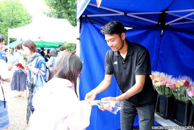 この他ブースでも選手たちがお手伝い。レディースデー企画の女性限定『切りバラ』プレゼントブースでは瀬沼優司選手が来場者の方にプレゼントさせて頂きました。