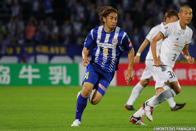 中盤で攻守のつなぐ中村俊選手。昨シーズンモンテディオ山形に期限付き移籍をしていた長沼洋一選手のマークを受けながらボールをキープします。