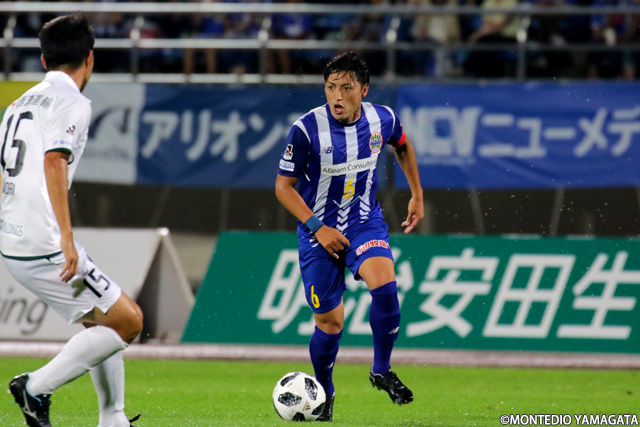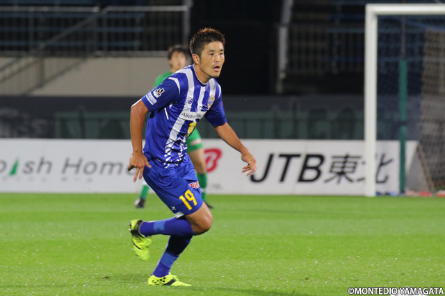 右サイドを激しくアップダウンする山田拓巳選手。試合展開としてはFC岐阜にボールを持たれる時間が長くなったものの、モンテディオ山形の選手たちはそれぞれの役割を全うし、得点を与えません。