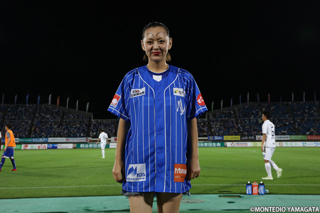 ハーフタイムには、この日レディースデーのイベントのために来場したものまね芸人みかんさんにもお手伝いいただいて、8月11日に開催される山形県民応援デーの告知をしました。みかんさんが着ているのが、来場者先着15,000人にプレゼントするサポーターズユニフォームです。詳しくはこちらのページをご覧ください。