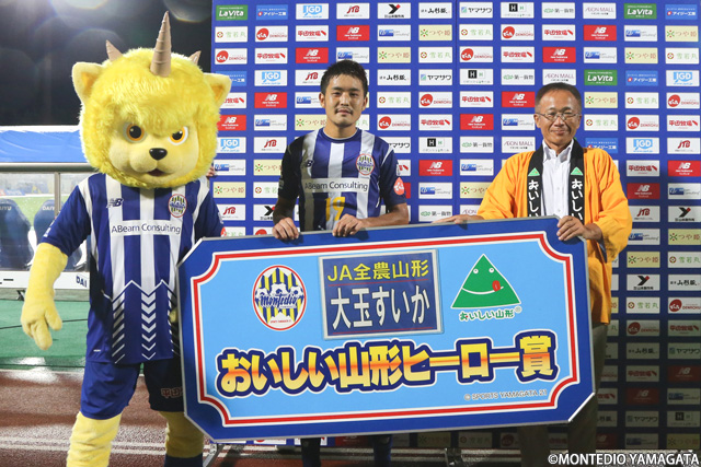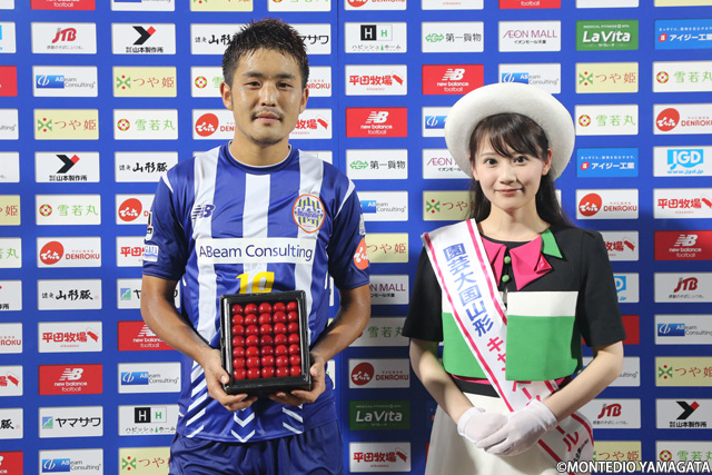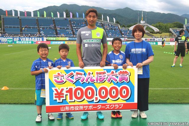 ピッチ内ウオーミングアップ前、山形市役所サポーターズクラブによる前半戦のMVP表彰、さくらんぼ大賞の授与が行われました。選ばれたのは守備の要としてチームを牽引した栗山直樹選手でした。