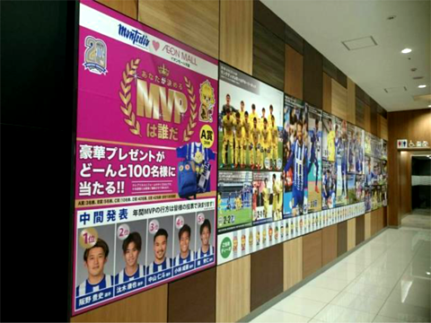 弊クラブスポンサーであるイオンモール天童様にて展開中の「がんばれ!モンテディオ山形アベニュー」での展示写真を、前半戦の激闘を振り返るプレー中の写真へと更新しましたのでお知らせいたします。