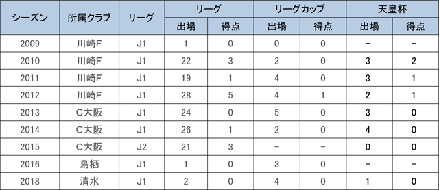 愛知川ジュニアFC→野洲ジュニアFC→セゾンFC→野洲高→同志社大→川崎フロンターレ-セレッソ大阪→サガン鳥栖→ウェスタンシドニー/オーストラリア→清水エスパルス