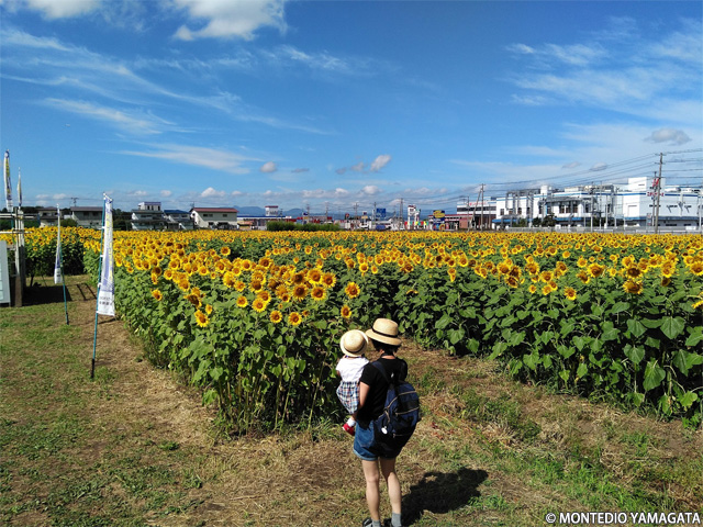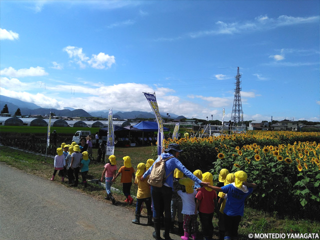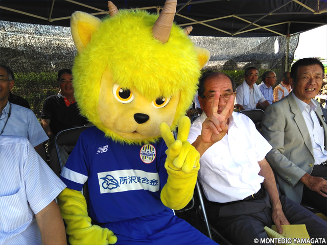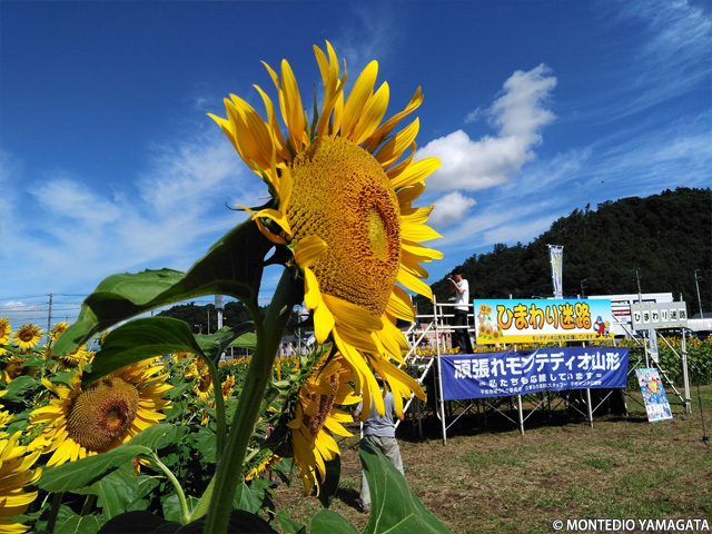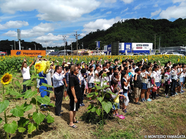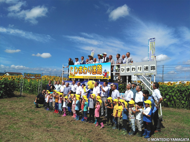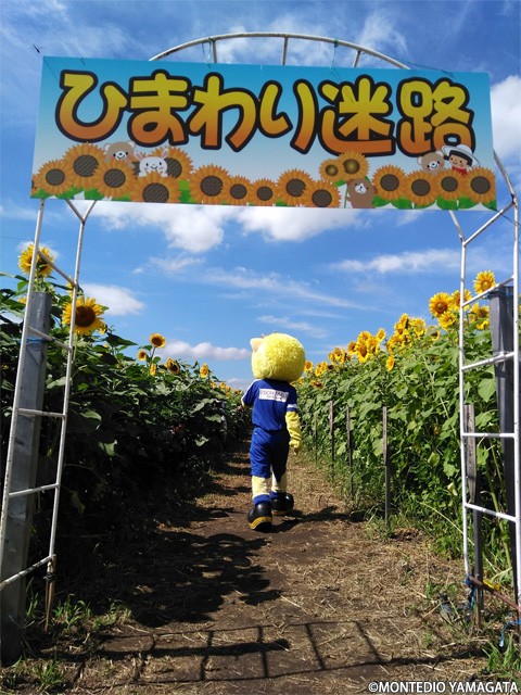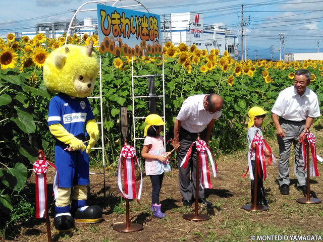 2018年7月30日、この日も猛暑となった天童市、スタジアムに程近い干布地区のひまわり畑が満開となり、ひまわり迷路が開園し、ディーオが開園式に参加しました。