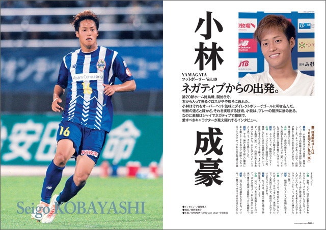 ロングインタビューは、チーム最多8ゴールを決めている小林成豪選手。バイシクルシュートを決めるなど豪快で迫力あるプレーをしながらも、素顔はちょっと内気。そんな小林選手の素顔に迫りました。そして、私服インタビューは天皇杯3回戦でもゴールを決めた坂井達弥選手。公私共に山形で充実している坂井選手に、普段の顔を見せてもらいました。他にも7月の試合を振り返るマッチレポートなども掲載しています。