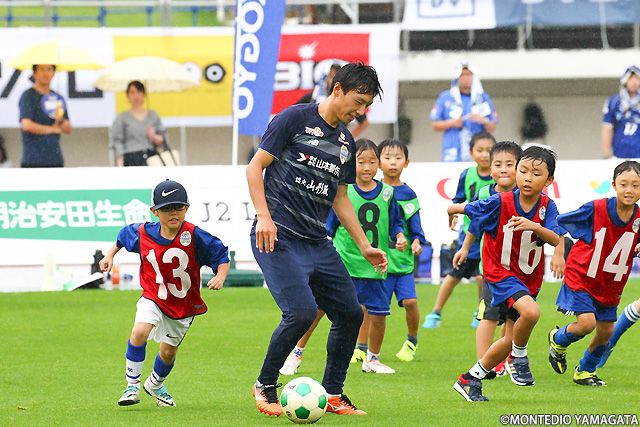 試合前のピッチではアイジー工業株式会社様ご協賛のモンテディオ山形サッカースクールが開催され、たくさんの子供たちがボールを追いかけます。射庭康太朗選手とクボンヒョク選手も参加。サッカーを一緒に楽しみました。