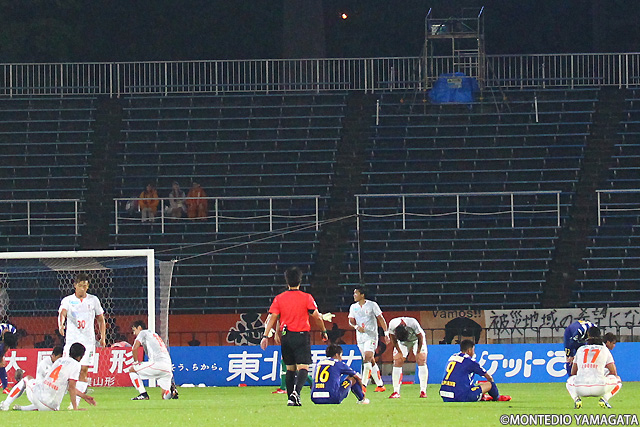 しかし試合は1-1のままタイムアップ、引き分けとなりました。試合終了のホイッスルとともにピッチに座り込む両チーム選手の様子に、この試合のハードさが表れています。