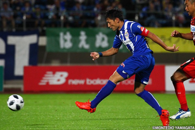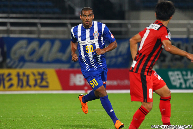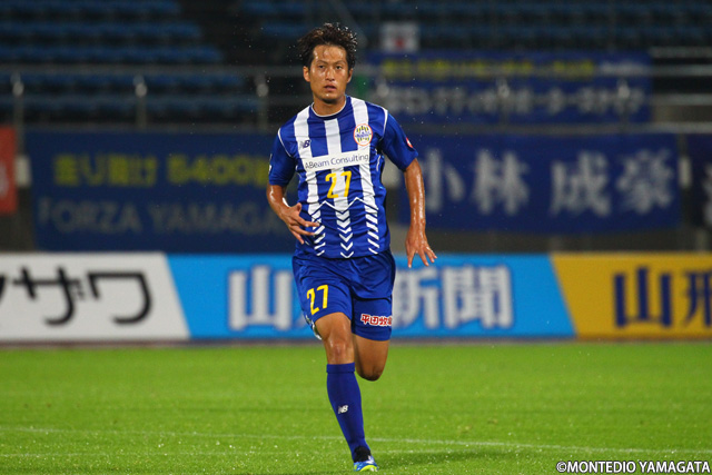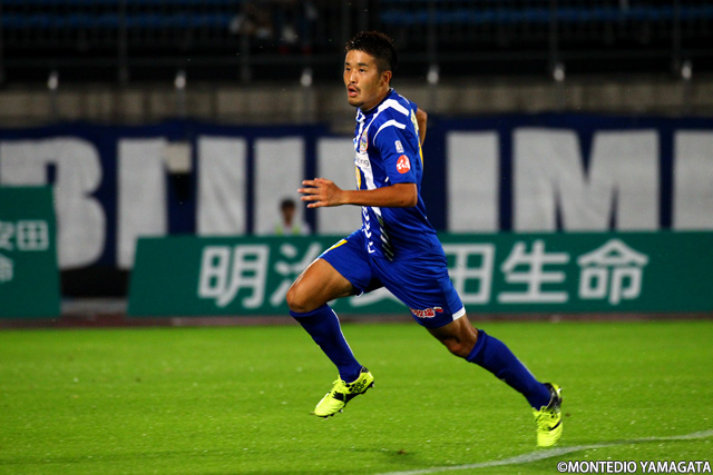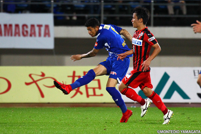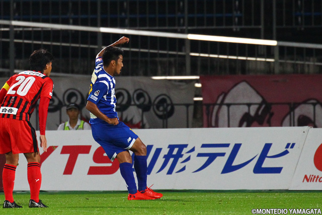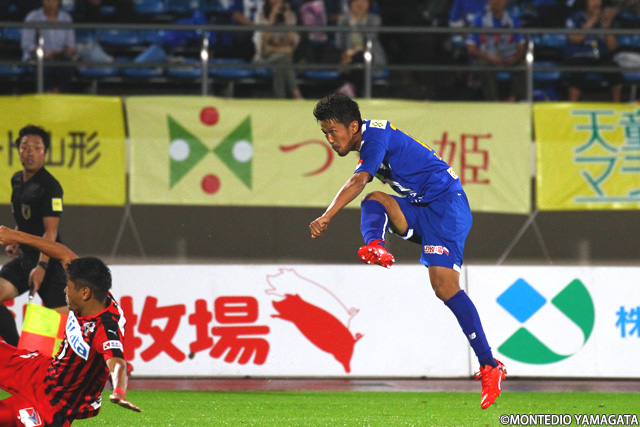 前半を1-0でリードして折り返したものの、後半の62分に7シーズンに渡ってモンテディオ山形で活躍した伊東俊選手にゴールを決められ同点に追いつかれてしまいますが、阪野豊史選手もさらにゴールを決めようと積極的にシュートを狙います。