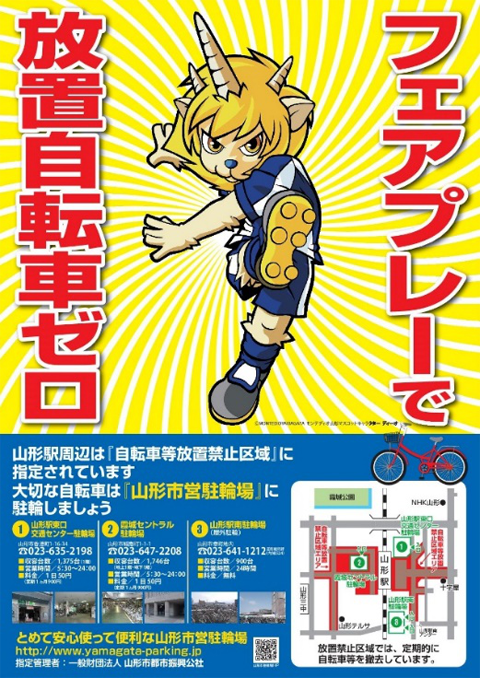 山形市では山形駅前周辺を自転車等放置禁止区域にしており、その対策のためのポスターにもディーオを起用頂いております。