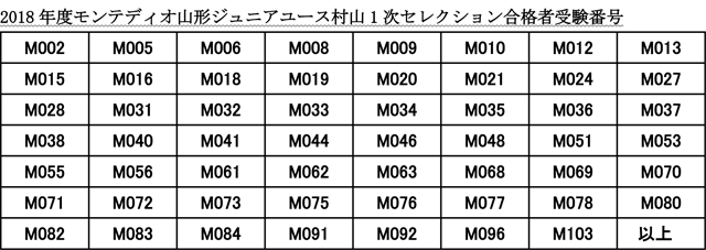 2018 年度モンテディオ山形ジュニアユース村山1次セレクションにご参加いただきありがとうございました。選考結果を以下の通り発表いたします。 なお、選考の結果に関するお問合せについてはお答えできませんのでご了承ください。