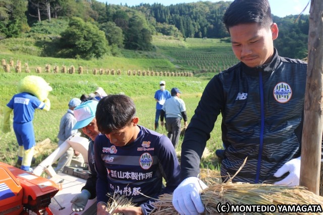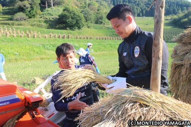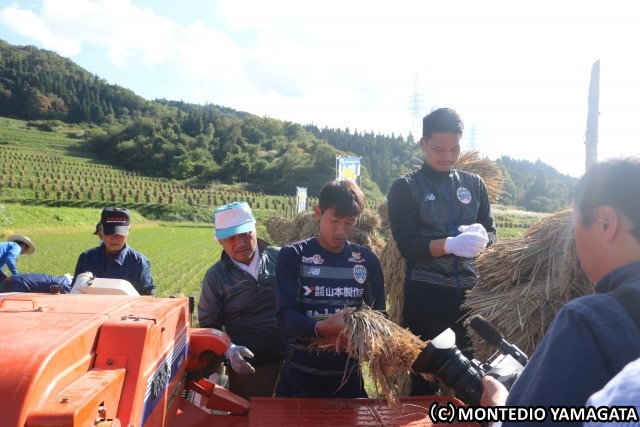 大蕨棚田「モンテ棚田米」収穫作業に松岡亮輔選手、射庭康太朗選手が参加しました