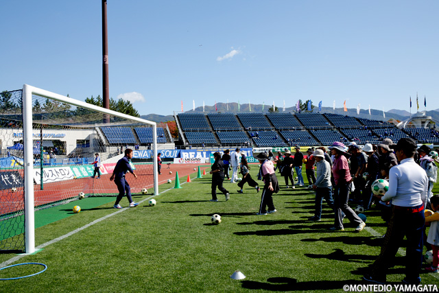 試合前のピッチではハクジュ山形様による認知症予防を目的とした健康イキイキフィットネス教室を開催。モンテディオ山形アカデミーコーチに中村駿太選手も加わり、サッカーボールなどを使って、世代を超えて楽しい雰囲気の中、健康づくりの運動が行われました。
