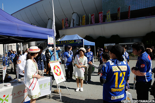 この試合はユニフォームスポンサーとしてもお馴染みの「雪若丸 サンクスマッチ」として開催されました。特設ブースでは雪若丸シート米がもらえるダーツゲームを実施して頂いたり、新米「雪若丸」を使用した山形牛丼、山形豚丼、特製おにぎりや人気の山形牛ミニステーキを販売をして頂きました。