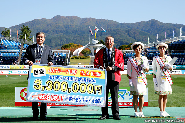 モンテディオ山形は日頃より、様々な地域の皆様から厚いご支援を頂いていますが、この試合でも贈呈を頂きます。JAグループ山形様からモンテディオ山形支援募金3,300,000円を、