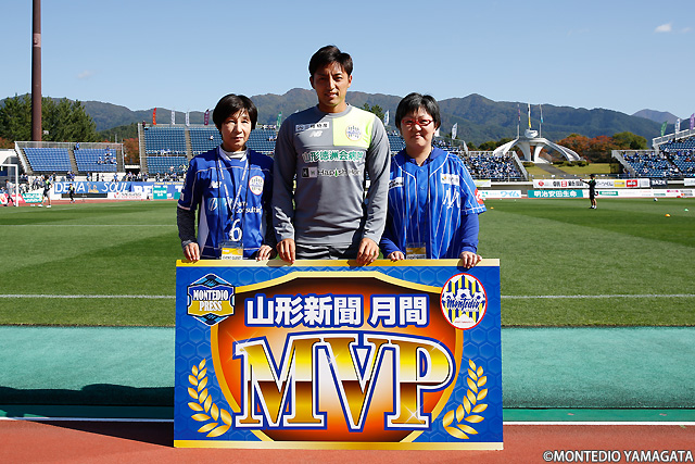 ピッチ内ウォーミングアップ前、9月の山新月間MVP賞の表彰が行われます。選ばれたのは、9月に開催された全6試合にフル出場しチームを牽引したキャプテン・山田拓巳選手です。