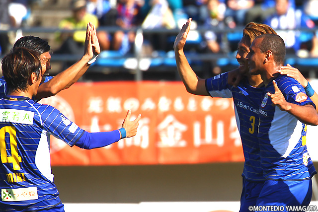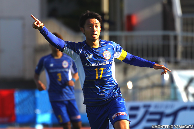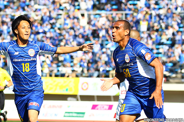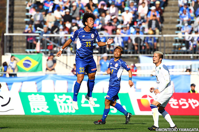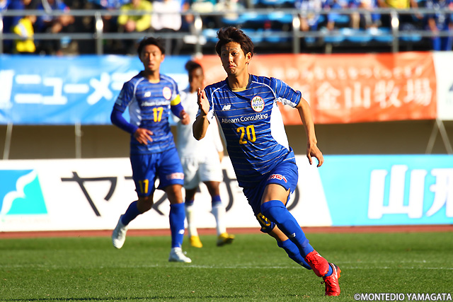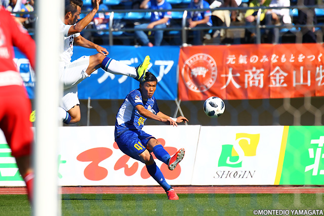 試合開始早々の前半9分、モンテディオ山形がスコアを動かします。左サイド深いところから内田健太選手が得意の左足でゴール前に鋭くボールを入れると、
