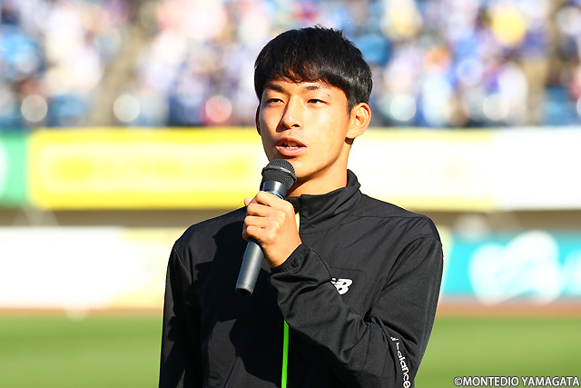 ハーフタイムにはモンテディオ山形ユースの半田陸選手がピッチサイドに登場。半田選手は先日マレーシアで開催されたAFC U16選手権でU-16日本代表のキャプテンとして全試合フル出場。来年開催されるU-17ワールドカップの出場権を得るとともにAFC U-16選手権優勝も果たしました。その報告をする半田選手にスタンドから大きな拍手が送られます。