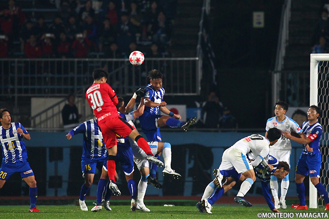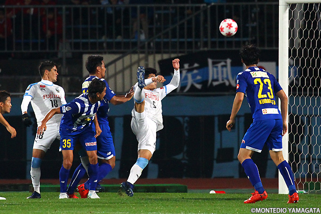 J1でも攻撃力の高さでは定評のある川崎フロンターレに対し自陣に押し込まれる時間が長くなるものの、ディフェンスリーダーの栗山直樹選手が中心となり、チームが一体となって奮闘します。